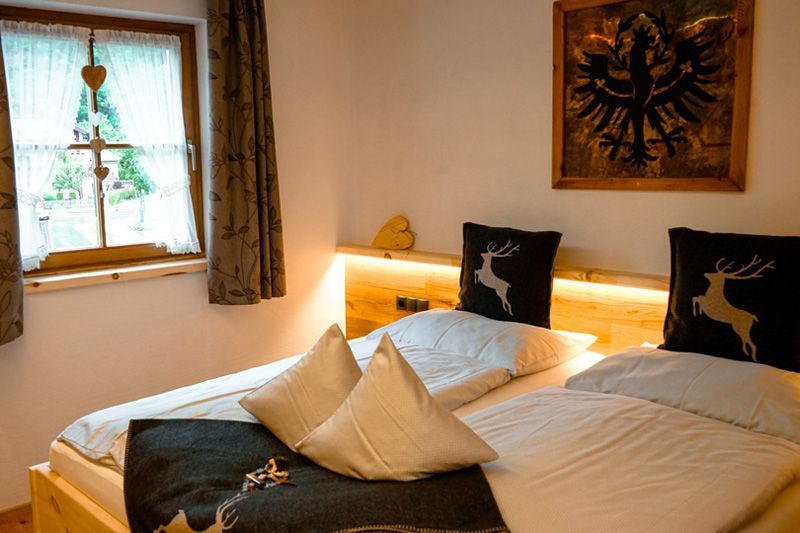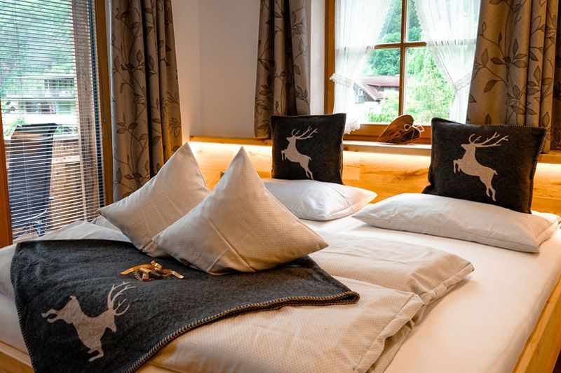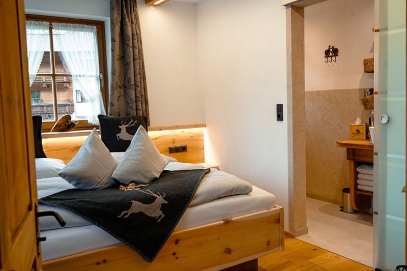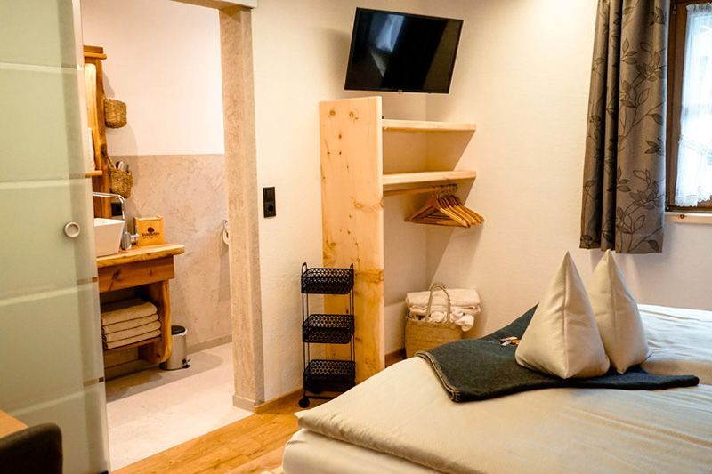 Für einen gesunden Schlaf sorgt das Zirben-Doppelbett mit offenem Zirben-Schrank, Kabel-TV und einer kleinen Sitzecke.