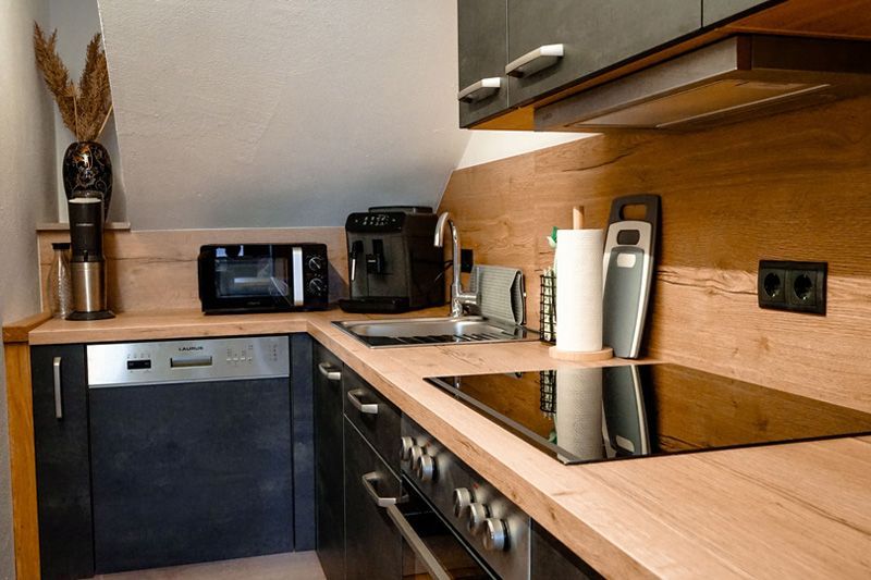reichlich Geschirr, Gläser, Mikrowelle, Elektroherd mit Backofen, Geschirrspüler, Wasserkocher, Soda Stream, Eierkocher, Kühlschrank, Geschirrtücher und Kaffeevollautomat