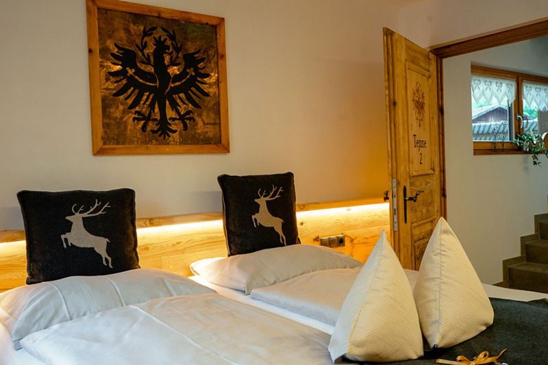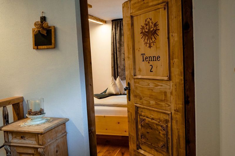 65m² erwarten Sie im 1. Stock der Scheune. Schlafen Sie sich gesund - im Zirben-Doppelbetten und dem offenen Zirbenschränken der Tenne 1 und dem nebenanliegenden Doppelzimmer Tenne 2.